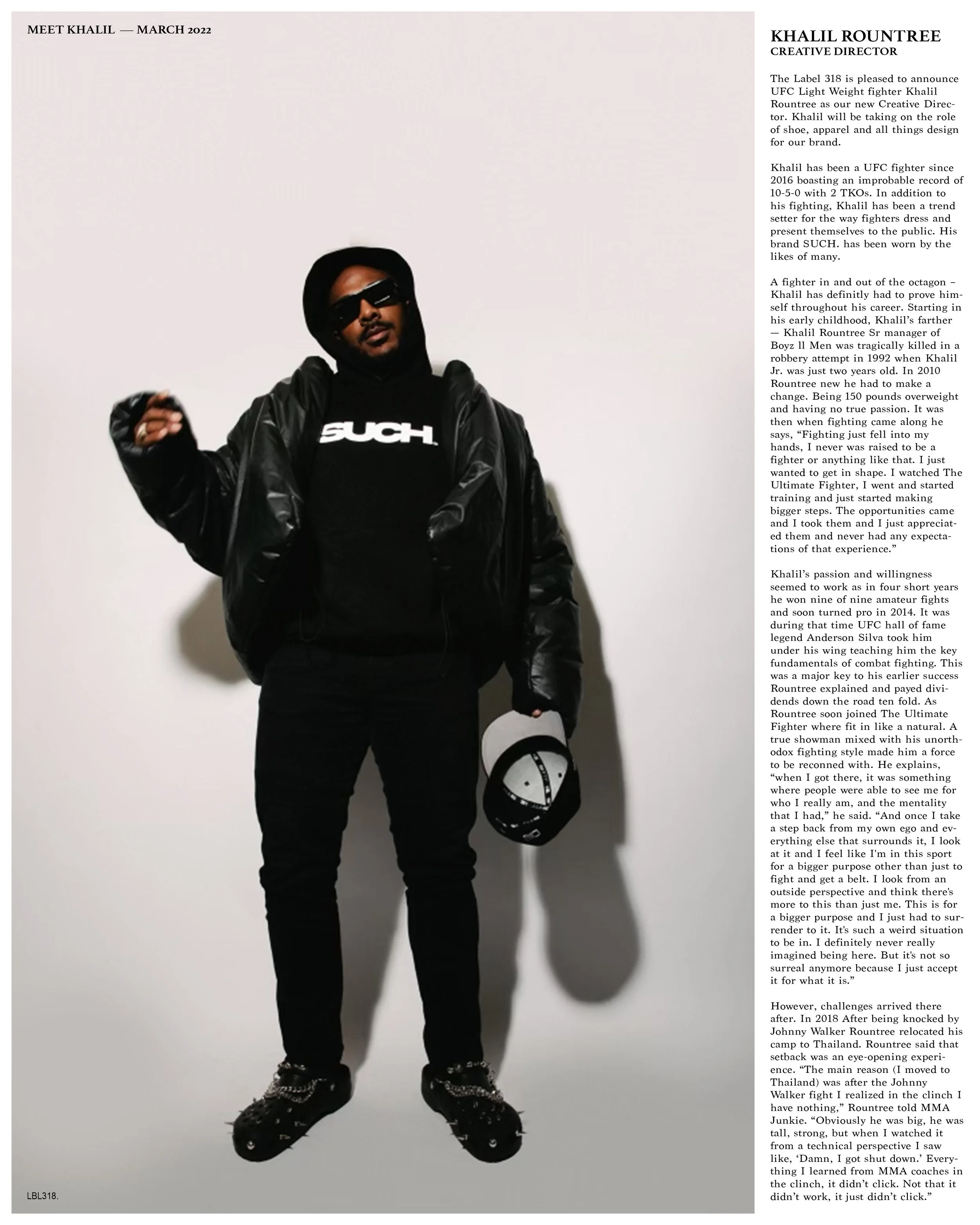 The Label 318 is excited to welcome UFC Light Heavyweight fighter Khalil Rountree as our new Creative Director. Khalil will be taking on the role of shoe and all things design for our brand.